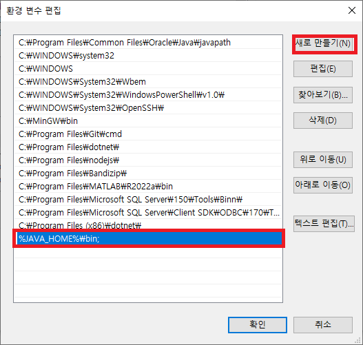 6. 새로 만들기를 선택후 %JAVA_HOME%\bin 을 추가합니다.