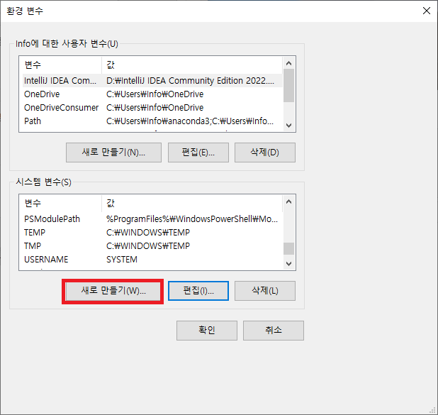 5. 시스템 변수에 Path를 더블클릭 하거나 편집을 눌러 Path 편집 화면으로 이동합니다.