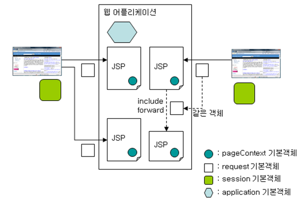 | application | 하나의 웹 어플리케이션과 관련된 영역 웹 어플리케이션당 1개의 application 객체가 생성됨 같은 웹 어플리케이션에서 요청되는 페이지들은 같은 application객체를 공유함 |